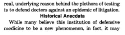 “In human medicine today, patients frequently complain about unnecessary and expensive tests. On the other hand, physicians claim these tests to be necessary, and offer plenty of scary rationalizations to justify them. Many observers agree, however, that the real, underlying reason behind the plethora of testing is to defend doctors against an epidemic of litigation.”