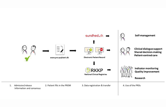 National and local calls for greater patient involvement at the point of care, and more focus on patient outcomes (PROs) as a quality indicator, prompted the senior management at the psychiatric hospital in North Denmark Region to develop a new approach to management based on using patient reported outcomes in routine clinical care. [1] The initiative, called PRO-Psychiatry, was launched in 2016 and has grown to become a national research and action-oriented initiative within the Danish National Clinical Registries for depression and schizophrenia. The key components are: