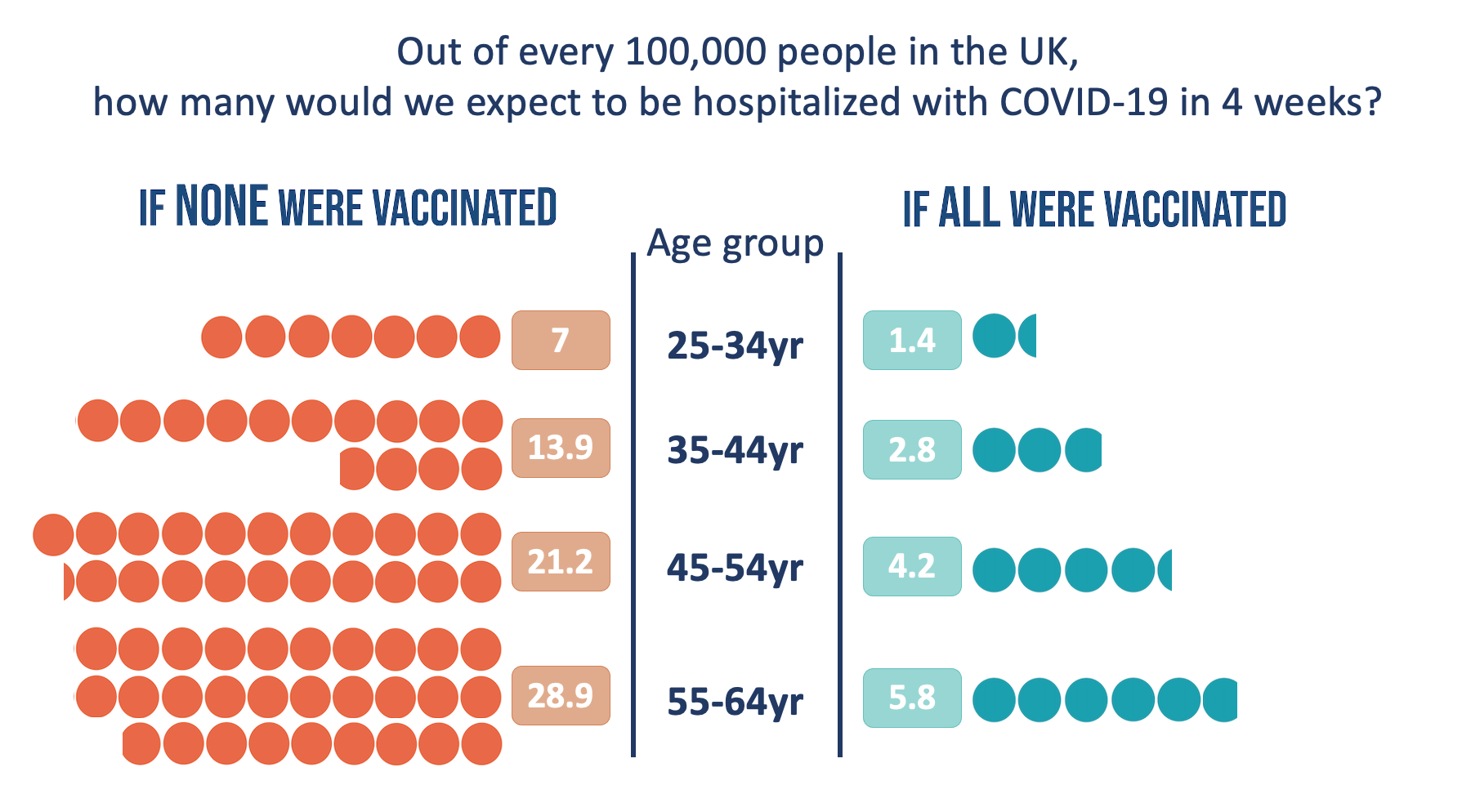 Of course there are subtleties to this graphic—we had to choose a fixed time point (16 weeks) to visualise the potential benefits over, as they continue to accrue over the lifetime of the vaccine’s protection, and we produced three versions illustrating different levels of exposure to the virus, which would affect the level of the potential benefits as well.