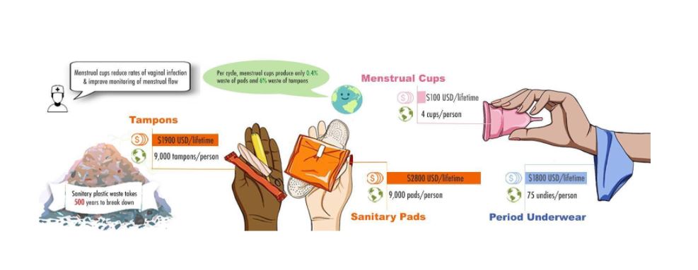Reusable menstrual products could help mitigate “period poverty,” which is an experience whereby people who menstruate need to resort to alternative and less sanitary means of managing their periods due to financial barriers. Period poverty is highly prevalent as single-used menstrual products are not always financially accessible. The estimated cost of single-use tampons and pads is about $160 USD per year. A recent study also identified that one-third of Canadian women under the age of 25 have struggled to afford menstrual products. There are accumulating economic advantages to the long term use of reusable menstrual products, albeit there may be higher up-front costs; the estimated cumulative purchasing costs of menstrual cups over a person’s lifespan is only 5% of the cost of pads and 7% of that of tampons. Thus, promoting reusable alternatives can also play a role in increasing access to menstrual products and alleviating period poverty.