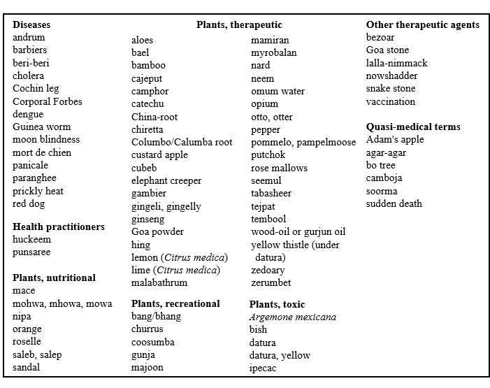 Many articles have been written about Hobson–Jobson, but I have seen no discussion of its medical content. Burnell died in 1882 and Yule in 1889. William Crooke published a second edition in 1903, in which I have found 84 items of medical interest (Box 1). Crooke indicated his additions by enclosing them in square brackets. We can therefore tell that all but one of these terms was also included in the first edition, the exception being “rose mallows”, which Crooke defined as “A semifluid resin, the product of the Liquidambar altingia, which grows in Tenasserim; also known as Liquid Storax, and used for various medicinal purposes.”