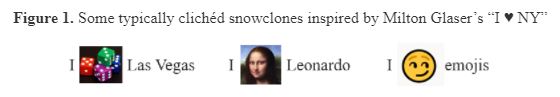 A common visual snowclone plays on graphic designer Milton Glaser’s famous “I ♥ NY” logo, which he devised in 1977 and 20 years ago redesigned as “I ♥ NY more than ever”, in the wake of the events of 9/11. An amusing snowcloned version of this proclaims that “I ♥♥♥ polygamy”. And the heart can be replaced with any other image you like (Figure 1).