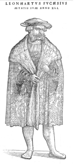 Leonhart Fuchs (1501–66), from a woodcut by Veit Rudolph Speckle, used as a frontispiece in his 1542 herbal (public domain)