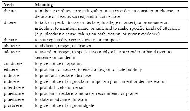 Latin derivatives of DEIK (Table 1) included the verbs dicare, dicere, and dictare, and others formed by adding prefixes. Nouns included dictator, a dictator, dictio, the action of speaking, dictum, an utterance, dictatio, a dictated draft, and dictata, dictated lessons.