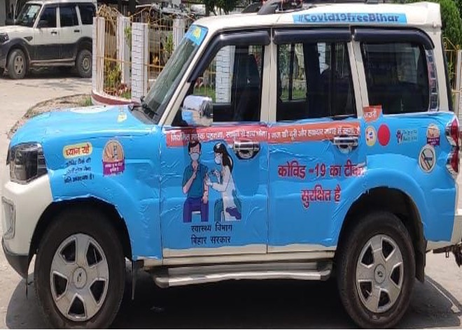 Considering these accessibility challenges, the Government of Bihar decided to take the vaccine to the communities through Vaccine Express in urban areas. On June 3rd, 2O21, Honb. Chief Minister of the Government of Bihar flagged off the “Teeka Express” (Vaccine Express). The Teeka Express is a mobile van shaped like a small utility vehicle. It has four components, i.e., Micro-planning, Community Mobilization, Human Resources and Vaccines and Logistics. The district/city health team collaborated with a representative from urban local bodies and community-based organizations to prepare the micro-plan with all the details of human resources and mobility routes. The vehicle-mounted loudspeaker was used with pre-recorded messages and jingles in Hindi to mobilize the community to the Vaccine Express. The vehicle was easily identifiable because of vaccination branding. Four role-based human resources were engaged, in which two ANMs were playing the vaccinator role, one data entry operator was making registrations (online on Cowin and offline), and he was also maintaining reports and records. The vehicle driver’s role was to take everybody with logistics to the site with the allocated community in Micro-plan for the specific day. Vaccines and logistics were the other components, which included vaccines, syringes, adverse events management kits, and bio-medical waste management, including supplies such as colored buckets, bags, and hub cutters.