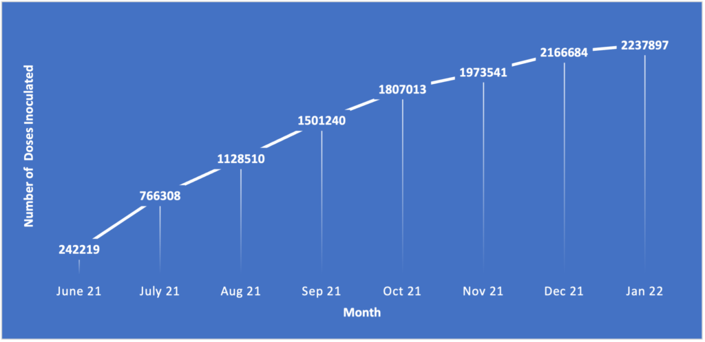 In just eight months, from June 2021 to January 2022, 2.2 million doses were inoculated in the urban communities (refer chart below). Anecdotal evidence also suggests that the Vaccine Express was able to cater to the accessibility challenges among vulnerable populations in urban communities. Due to this, the health system ensured the vaccines available during the pandemic.