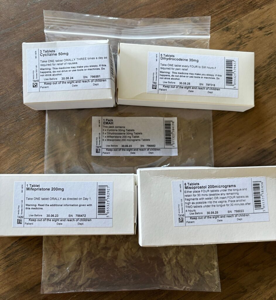 A strict limit to the amount of medicines that can be re-labelled or repackaged by end users is in place in the UK. Individual dispensing and labelling for a patient can be done under the supervision of a pharmacist. However, dedicated units possess licenses that allow for “packing down” and over-labelling of medicines in high volumes. We commissioned NHS Scotland’s Pharmaceutical Specials Service to provide Early Medical Abortion at Home (EMAH) packs that contained the following four medicines (see figure 1):