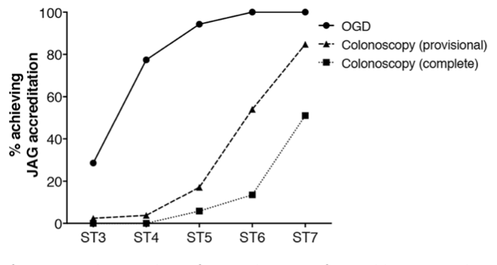 Figure 1. Proportion of trainees who achieved JAG accreditation for OGD and colonoscopy at each stage of training.4 JAG, Joint Advisory Group in Gastrointestinal Endoscopy; OGD, oesophagogastroduodenoscopy.