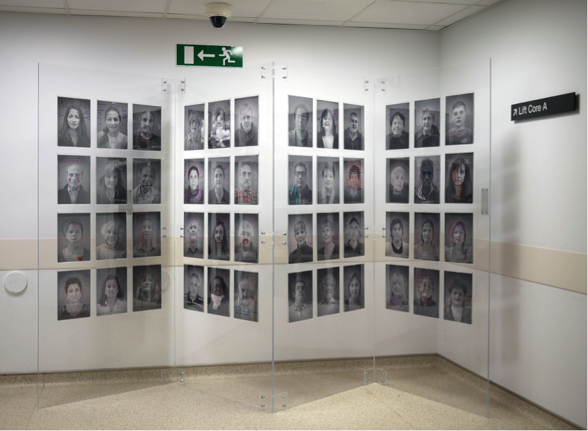 Now that I had secured this invaluable patient-centred work, it was important to give these people a voice in a more public way. Thus, the Patients As People exhibition was realized. Displaying artwork in a hospital setting comes with incredibly complex rules and regulations. Individual framed portraits on walls can be tricky, something that years of working with galleries and various venues had taught me. I sought inspiration from my biomedical environment and the many tests some of the patients had to endure in their pursuit of ‘getting better’. The idea was a play on the word and function of the X-Ray, a vision of one’s internal world. The exhibition itself could similarly be seen as a reflection of what was taking place within patients’ minds. A free-standing display was designed, containing several pockets where patient portraits could be contained.