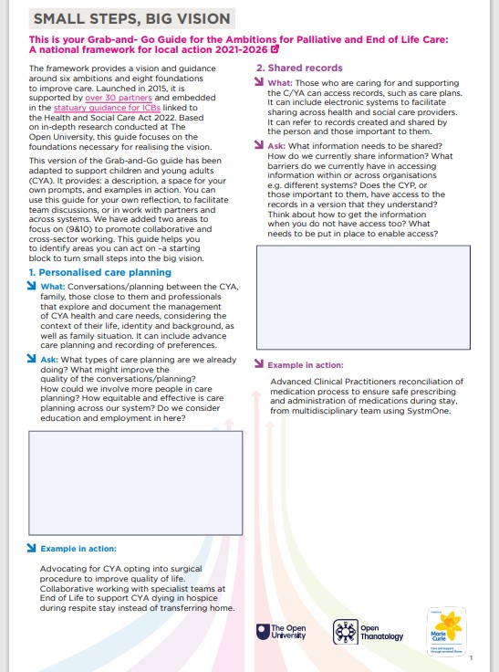 The Ambitions for Palliative and End of Life Care: A national framework for local action 2021-2026 is a framework developed by a range of organisations, including the NHS, social care, ambulance services and voluntary sector organisations (e.g. Marie Curie, Macmillan, Hospice UK and Sue Ryder). The framework provides a vision and guidance around six ambitions and eight foundations to improve care in England. Launched in 2015 and re-launched in 2021, it is supported by over 30 partners from both the statutory and voluntary sectors. It was embedded in the statuary guidance for the Integrated Care Boards as part of the Health and Social Care Act 2022. Based on in-depth research conducted at The Open University, the grab and go guide was one of the practical outputs which focused on the foundations necessary for realising the vision in the Ambitions. The grab and go guide was created with all services across the life course in mind. In 2024, St Oswald’s had the opportunity to work with The Open University to revise the grab and go guide focusing on children and young adults’ services.