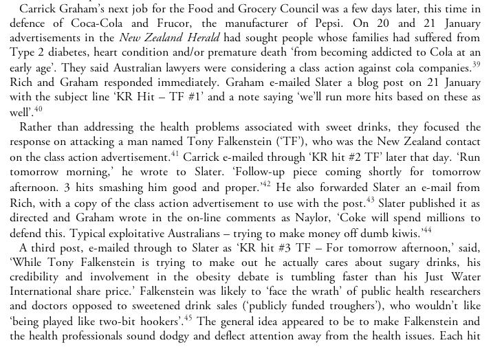 One such figure is public relations consultant and former British American Tobacco (NZ) corporate affairs manager Carrick Graham. The book alleges that Graham fed Slater a large amount of material, often attacks on scientists and advocates in the public health field working on tobacco, alcohol and obesity issues. Slater would schedule the posts unedited according to Graham’s instructions and with no indication that an external party supplied the posts. For this service, it is alleged that Graham paid Slater NZD$6555 per month.