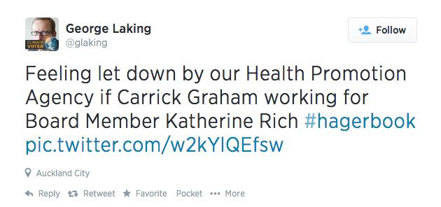 The book did not include direct evidence of Graham’s clients, however the correspondence between Slater and Graham does implicate Katherine Rich, who is both the chief executive of the Food and Grocery Council (FGC, representing companies selling alcohol, soft drinks, confectionery, tobacco), and a board member of the government’s Health Promotion Agency (HPA, informing health promoting policy and practice). A series of ‘hits’ was coordinated to defend the interests of FGC members:
