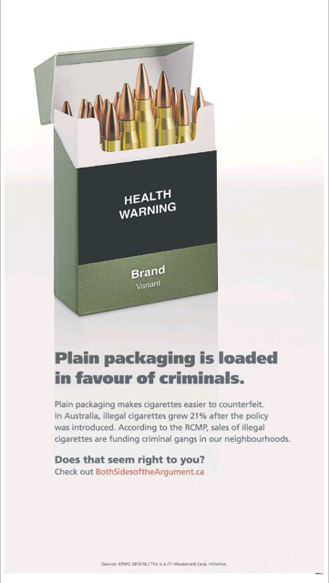 JTI-Macdonald is one of Canada’s big three tobacco firms. On Saturday 17 September, it ran an ad in several of Canada’s leading newspapers to argue against tobacco plain packaging legislation, which the Canadian government is currently considering. The ad is shown here:
