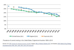 In 2013, there were 16.4% of Australians aged 18 years and over who smoked. By 2016, this number had fallen to 15.7%. By contrast, the US rate for 2016 is 15.8%, a sliver higher than Australia’s 2016 rate. England’s rate in 2016, according to the long running Opinions and Lifestyle Survey, was 15.8%, again marginally higher than Australia’s.
