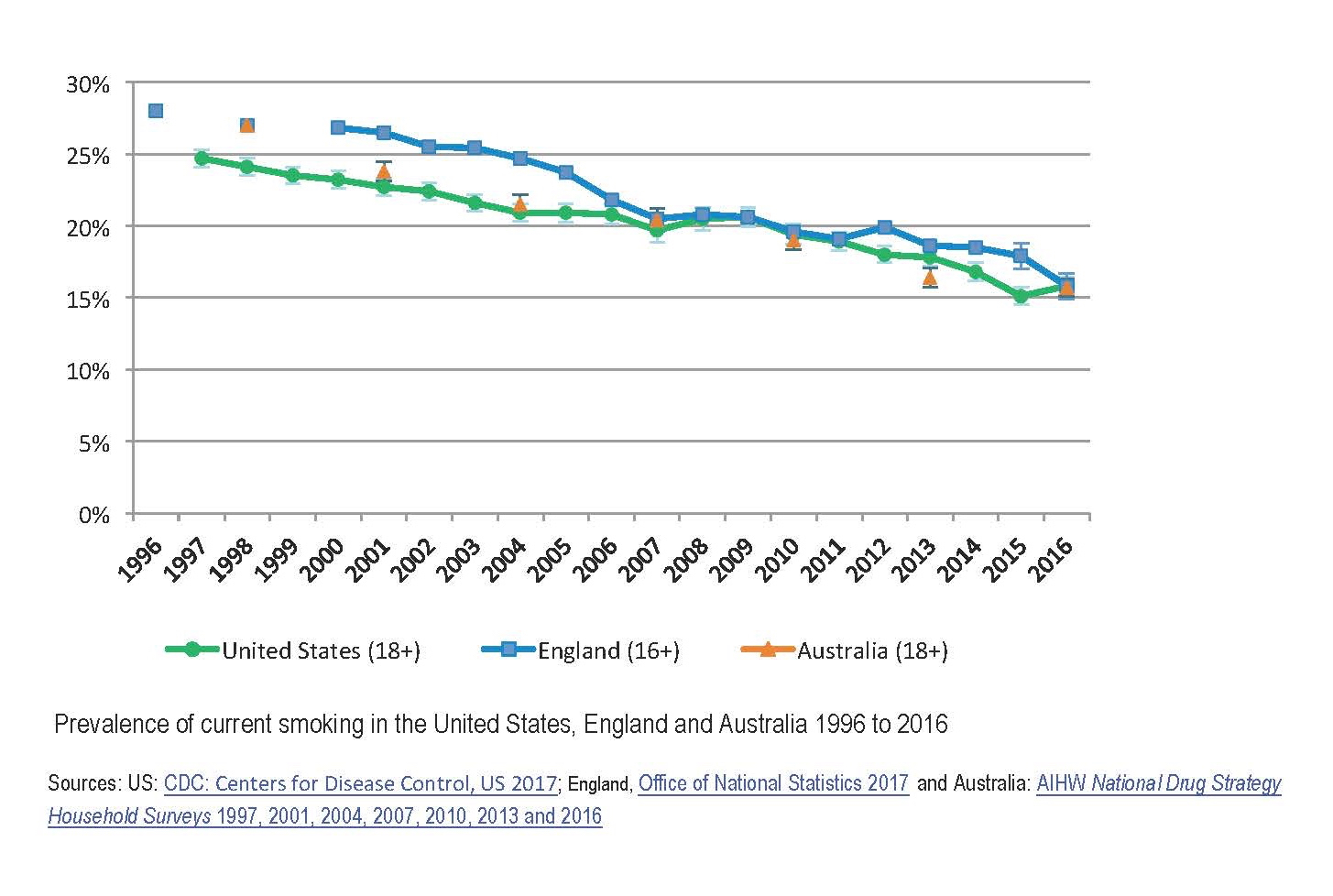 The Australian Institute of Health and Welfare (AIHW) surveys national smoking prevalence every 3 years as part of its National Drug Strategy Household Survey. We also have annual data from England and the US on smoking rates with which we can compare Australia’s progress.