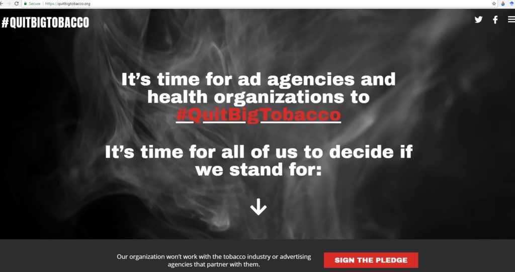The campaign launched with a website at QuitBigTobacco.org and a social media campaign, #QuitBigTobacco. The idea is to expose these affiliations and pressure marketing and advertising agencies to drop their relationships with the tobacco industry. Tobacco claims more than 7 million lives each year. The tobacco industry uses aggressive marketing to hook young people and turn them into life-long smokers; advertising is a culpable vector for the death and misery it causes.