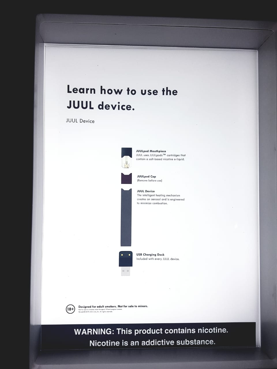 The JUUL packaging includes a warning label in Indonesian, which warning translates to “this product is only to be used with JUUL pods that contain nicotine. Nicotine is a chemical that has addictive properties.” This warning primarily relates to concerns in Indonesia around use of other substances, specifically cannabis, in e-cigarette devices.