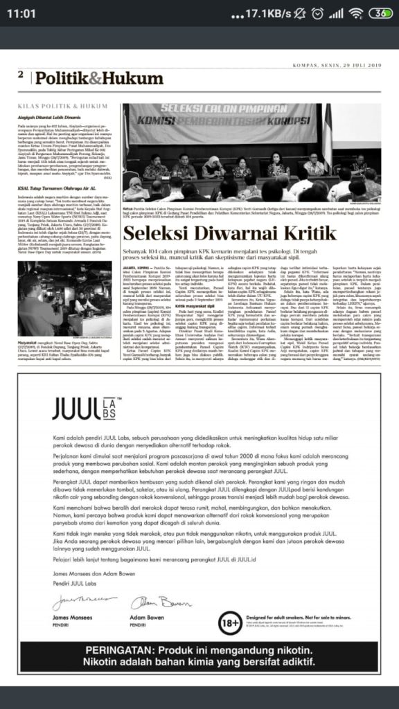 Advertisements, which feature a letter from JUUL’s founders, have appeared in many media outlets, including the popular national newspaper, KOMPAS (Figure 3). Thus far, it appears that social media advertising from JUUL has not yet begun.