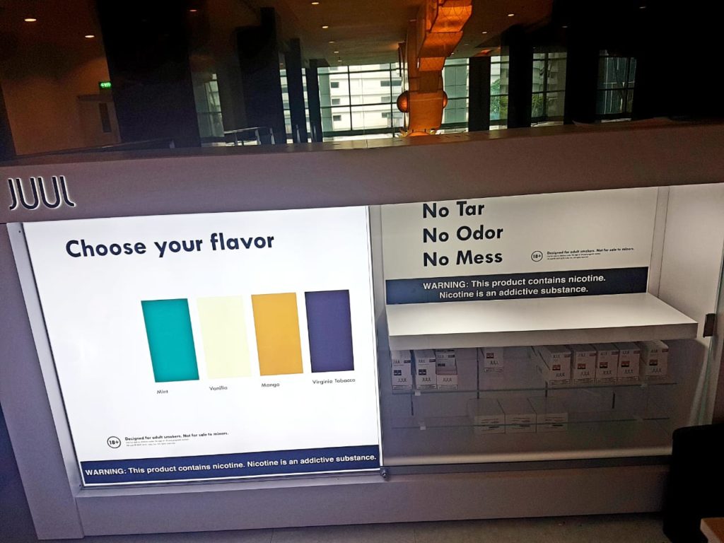 Though there are no JUUL kiosks in the U.S., JUUL has set up kiosks in other countries. In Jakarta, Indonesia there is a sleek booth on the first floor of a popular mall in South Jakarta (Figure 1A-D). Although the booth has 18+ signs, this mall is also the site of children’s events like YUPI wonderland and permanent stores like Kidz Station and Kidzania. There is another outlet in the Bali mall, Beachwalk Shopping Center. Two more outlets are expected to open in popular malls, Plaza Indonesia (Central Jakarta) and Cilandak Town Square (Citos, in South Jakarta).