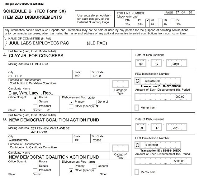 According to the Federal Election Commission (FEC), in the October Monthly report covering September 1-30, 2019, JUUL Labs Employees Political Action Committee (JLE PAC) made investments to the New Democrat Coalition Action Fund ($5,000), Clay Jr. for Congress ($1,000) (Figure 1), and has year to date contributions to federal candidates/committee and Other Political Committees totaling $79,000 (item #23 under Disbursements).