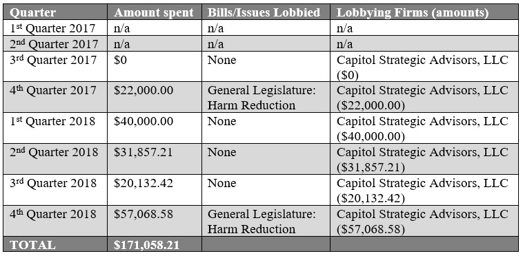 JUUL Labs, the new e-cigarette giant, filed a Lobbying Firm Activity Authorization form during the third quarter of 2017. Since then, the Center for Tobacco Policy and Organizing began tracking their investments in California Politics. JUUL exclusively has invested over US$171, 000 in the 2017-2018 election cycle (Table 1).