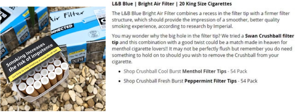 Tobacco companies have long harnessed consumers’ misperceptions about menthol to appeal to new populations of young smokers – a key strategy to securing profits. Tobacco companies attempted to undermine the ban in Canada by heavily promoting menthol capsule cigarettes prior to the ban and thereafter by introducing packaging, filter tip colours, and text descriptors that conveyed menthol-like qualities. Now, following the UK menthol ban, tobacco companies continue to evolve and are using ever more sophisticated tactics to exploit loopholes by introducing new products that fall outside the ban, for example accessories sold separately from cigarette packs such as menthol filters (including ones that can slot into filter holes in cigarettes, see Image 1), menthol capsules and even menthol ‘flavour infusion’ cards that can be inserted into packs of cigarettes which take on the flavour and aroma of the card, as well as menthol flavoured cigarette-like cigarillos complete with flavour capsules.